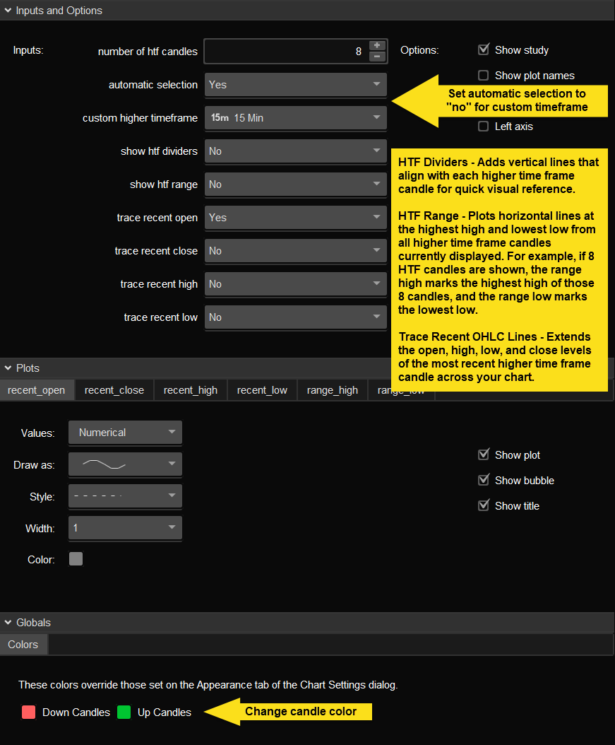 - Fully customizable: Choose either automatic or manual higher time frame selection, plus fine-tune with advanced options: