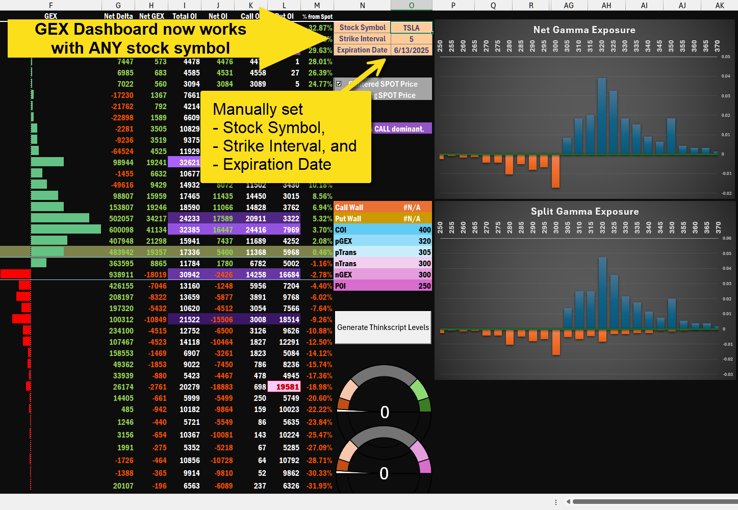 With its clear and intuitive visualizations, the dashboard enables traders to quickly assess critical strike levels, making it easier to respond to market movements in fast-paced environments. The tool also includes gauges for instantly evaluating call and put strength, supporting rapid decision-making in dynamic trading conditions.